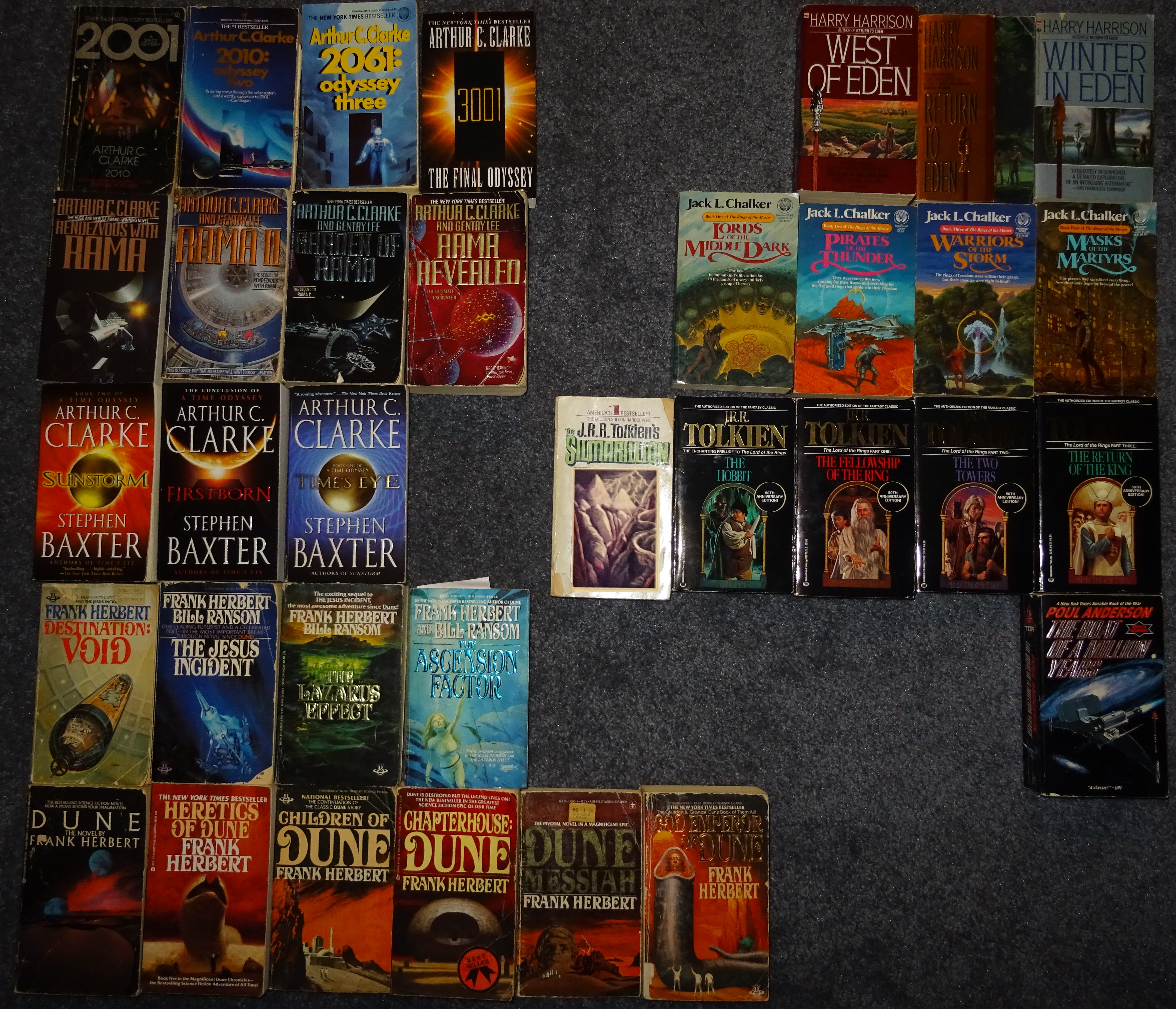Arthur C. Clarke 1. - 2001: A Space Odyssey 2. - 2010: Odyssey Two 3. - 2061: Odyssey Three 4. - 3001 The Final Odyssey 5. - Rendezvous with Rama 6. - Rama II 7. - The Garden of Rama 8. - Rama Revealed 9. - Sunstorm 10. - Firstborn 11. - Time's Eye Frank Herbert 12. - Destination: Void 13. - The Jesus Incident 14. - The Lazarus Effect 15. - The Ascension Factor 16. - Dune 17. - Dune Messiah 18. - Children of Dune 19. - God Emperor of Dune 20. - Heretics of Dune 21. - Chapterhouse: Dune Harry Harrison 22. - West of Eden 23. - Winter in Eden 24. - Return to Eden Jack L. Chalker 25. - Lords of the Middle Dark 26. - Pirates of the Thunder 27. - Warriors of the Storm 28. - Masks of the Martyrs J.R.R. Tolkien 29. - The Silmarillion 30. - The Hobbit 31. - The Fellowship of the Ring 32. - The Two Towers 33. - The Return of the King Poul Anderson 34. - The Boat of a Million Years